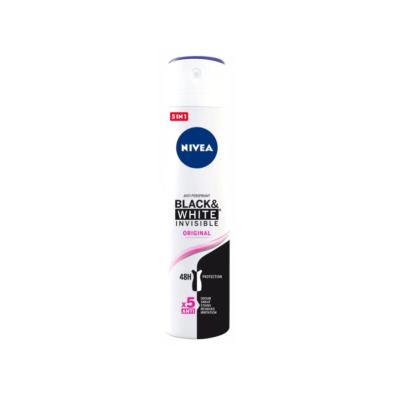 NIVEA Black & White Invisible Original Spray ofrece 48 horas de protección antitranspirante cuidando la piel. Su fórmula ofrece 5 acciones: bloquea el olor con su poderosa fragancia, evita el sudor con 48 horas de eficacia antitranspirante, protege contra las manchas para mantener el color original de la ropa blanca y oscura, no deja residuos en la piel ni en la ropa y previene las irritaciones de la piel ya que ha sido comprobado dermatológicamente.