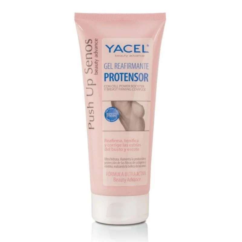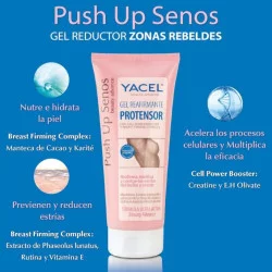 YACEL Push up senos es un gel protensor que aporta un poderoso efecto reafirmante y tonificante; mejora la arquitectura de los senos, estos aparecen más firmes; a nivel del escote la piel se hidrata en profundidad reduciendo y previniendo la aparición de estrías. La exclusiva fórmula reafirma, tonifica y corrige las estrías del busto y escote, realzando la belleza de los senos.