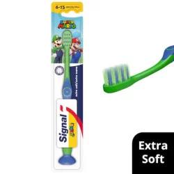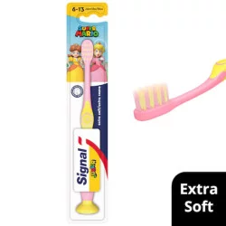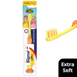 Signal Cepillo de Dientes Junior 6-13 años está diseñado tanto para dientes de leche como permanentes. El cabezal redondeado es ideal para respetar el esmalte y las encías durante el cepillado nocturno y diurno. Las cerdas extra suaves con puntas muy delgadas (0,01mm) proporcionan una limpieza efectiva pero delicada en el fino esmalte de los dientes de los niños, en los espacios interdentales y en la parte posterior. El tamaño y la forma ergonómica del cepillo de dientes son perfectos para el agarre de las manos de los niños. ¡Con divertidas patas adhesivas que se sostienen solas en las superficies del baño, haciendo que el cepillado sea divertido!