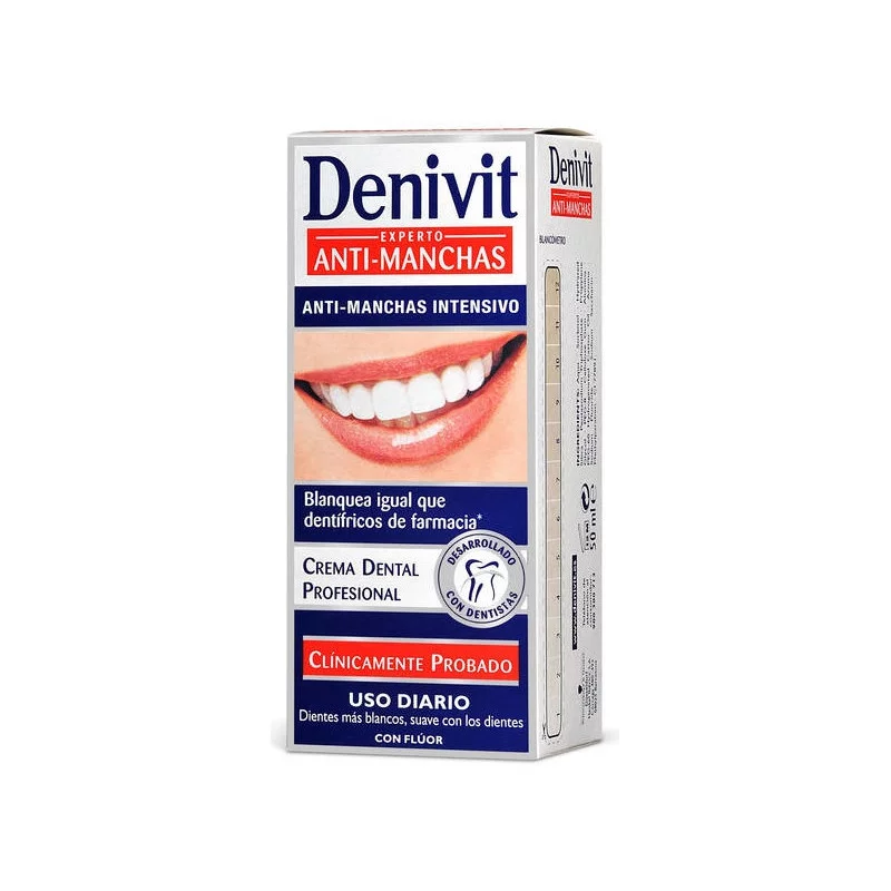 Denivit Anti Manchas es una crema dental con flúor, desarrollada en colaboración con dentistas para una alta eficacia anti manchas gracias a la actuación de su Sistema Blanqueador: