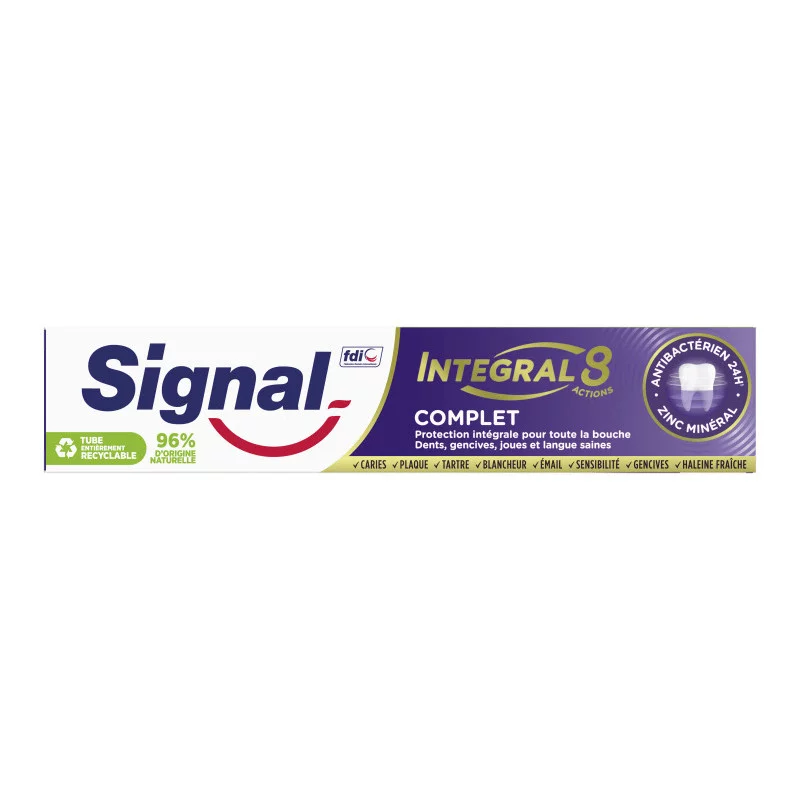 La fórmula del dentífrico Signal Integral 8 Complete te protege contra los 8 principales problemas bucodentales: protección contra la caries, encías reforzadas, esmalte reforzado, acción blanqueadora, aliento fresco, antiplaca, antisarro y antibacteriano.