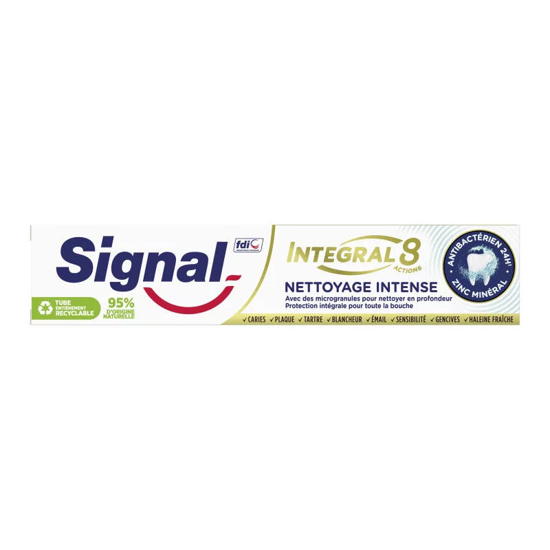 La fórmula del dentífrico Signal Integral 8 Aliento Fresco te protege contra los 8 principales problemas bucodentales: protección contra la caries, encías reforzadas, esmalte reforzado, acción blanqueadora, aliento fresco, antiplaca, antisarro y antibacteriano.