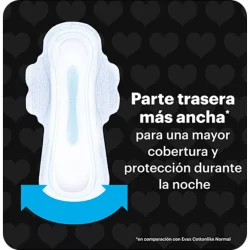 Las compresas Evax Cottonlike Noche están diseñadas para ofrecerte la protección que necesitas por la noche y así ayudarte a dormir mejor. Son más anchas atrás* para una mayor cobertura allí donde más la necesitas, sea cual sea tu postura al dormir. El Sistema Evax Cottonlike Dual incorpora unas perlas activas que neutralizan el olor y su núcleo superabsorbente captura el flujo menstrual al instante. De larga duración, con alas para mantenerse en su sitio y una cobertura Cottonlike para mayor suavidad, estas compresas harán que te sientas cómoda y te permitirán dormir toda la noche sin interrupciones.