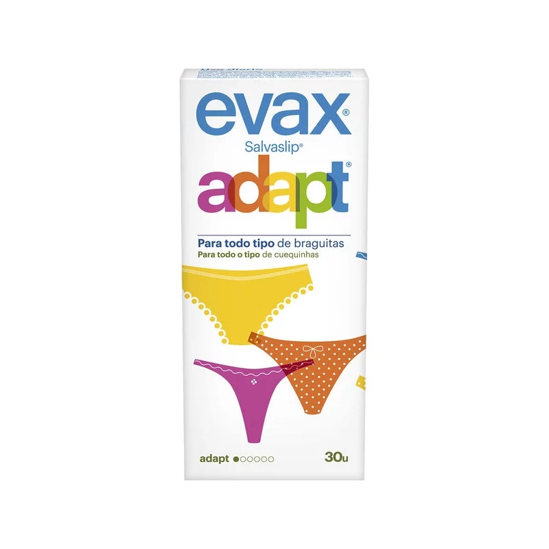 Para que te sientas limpia y fresca todos los días, tienes Evax Salvaslip Adapt. Tan suaves como tus braguitas, debido a su cobertura con tacto de algodón, estos protegeslips te ayudarán a sentirte cómoda y fresca gracias a su tecnología No Olor que neutraliza el olor. Además, su núcleo superabsorbente y las bandas de protección lateral te mantendrán protegida todo el día. Disponibles en tres niveles de absorción: normal, maxi y maxi plus, para adaptarse al nivel de protección que necesites al adaptarse a la perfección a cualquier prenda interior que quieras lucir.