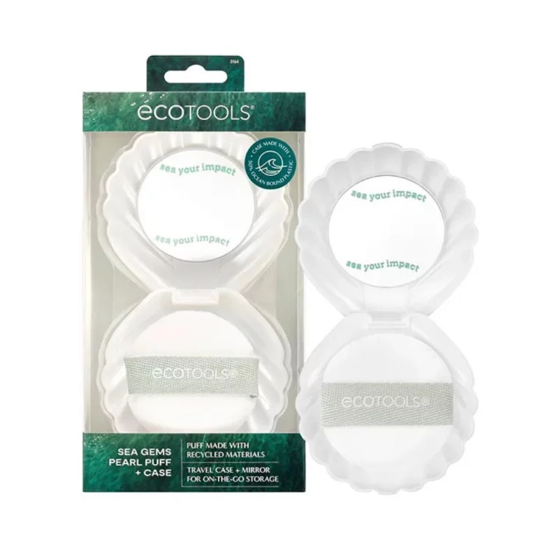 La borla de maquillaje Sea Gems Pearl Puff + Case de EcoTools incluye nuestra borla de maquillaje inspirada en el mar para suavizar y matificar el maquillaje, así como un estuche de viaje, perfecto para retocar sobre la marcha. La borla de maquillaje está diseñada con una banda para los dedos para una aplicación controlada con los dedos. Simplemente sumerja la borla facial en su polvo suelto o compacto favorito y golpee suavemente el exceso de producto en su mano. Luego presiónelo suavemente sobre su piel para hornear y fijar el maquillaje.