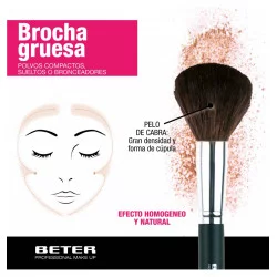 La densidad y el corte del pelo en forma de cúpula es idóneo para aplicar y extender de forma homogénea todo tipo de polvos: compactos sueltos o bronceadores. Aplica los polvos mediante ligeros toques por el rostro y cuello para unificar el tono y evitar un salto de color. Acaba con un movimiento circular para una cobertura total sin brillos y obtener un look totalmente natural.