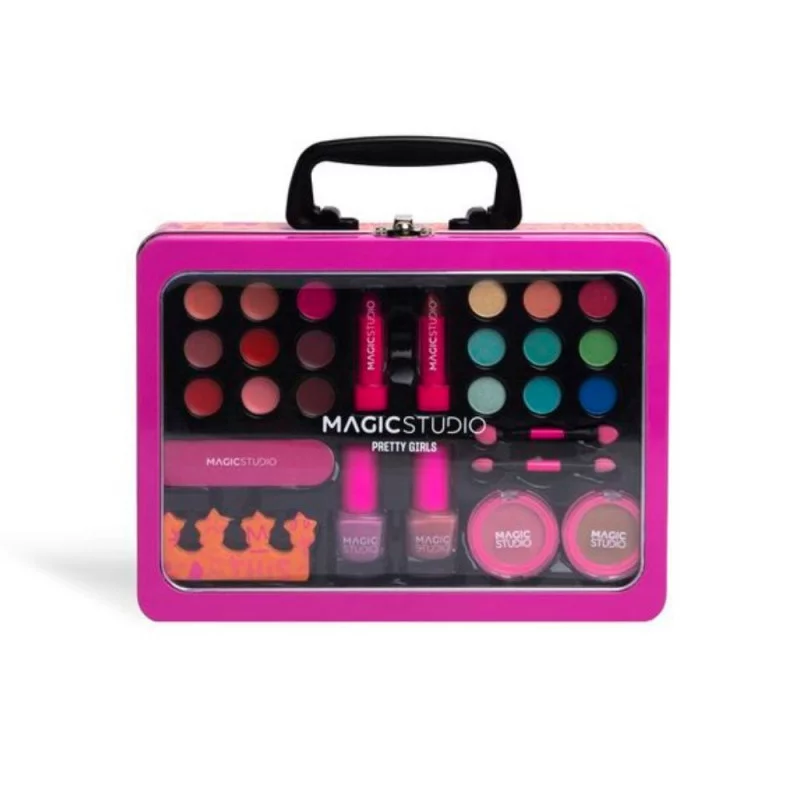 Estuche de maquillaje y uñas para chicas bonitas de Magic Studio. Este set contiene 9 sombras de ojos en tonos rosas, azules y verdes que permiten crear diversos looks.