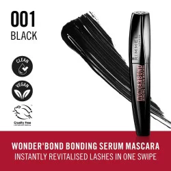 La nueva máscara de pestañas Wonder'Bond Bonding Serum de Rimmel revitaliza instantáneamente las pestañas con una sola pasada para lograr unas pestañas más largas, suaves y de aspecto más saludable. Desarrollado por Biotin Bonding Complex, ¡con hasta un 350 % más de volumen! Inspirada en los sueros reparadores de enlaces, la fórmula única de Rimmel mejora visiblemente la calidad de las pestañas.