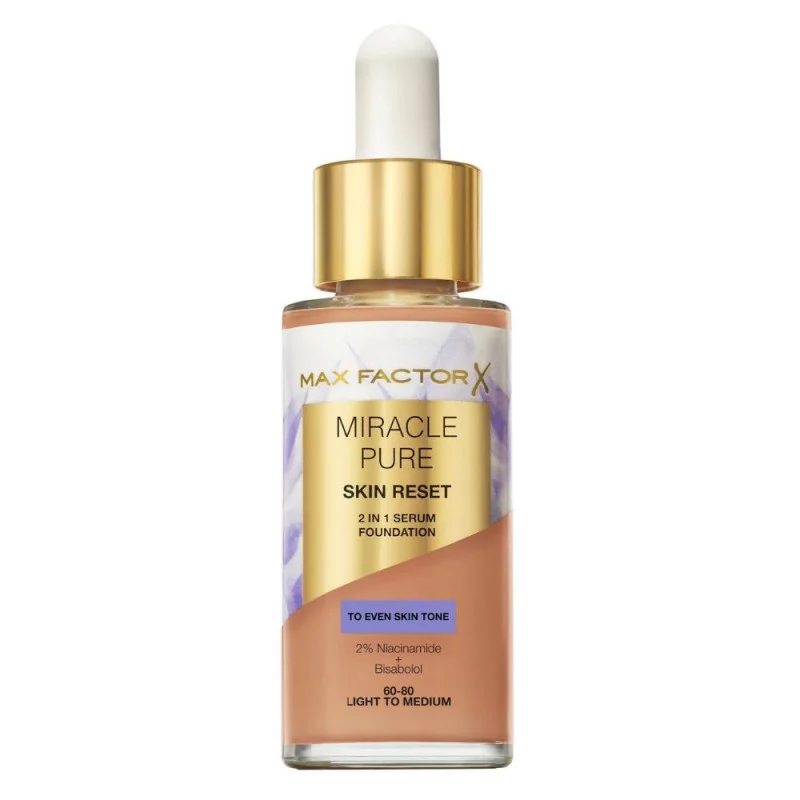 Listo, listo y listo con Max Factor Miracle Pure 2in1 Skin Reset. Una fórmula de suero 2 en 1 combinada con base que proporciona una cobertura perfeccionadora instantánea y un tono de piel más uniforme. Enriquecida con un complejo de restablecimiento de niacinamida al 2 % y bisabolol, esta base de Max Factor está clínica y dermatológicamente probada. Disfruta de una piel de aspecto saludable con una cobertura media y natural y un acabado mate satinado, disponible en 9 tonos. Apta para pieles sensibles.