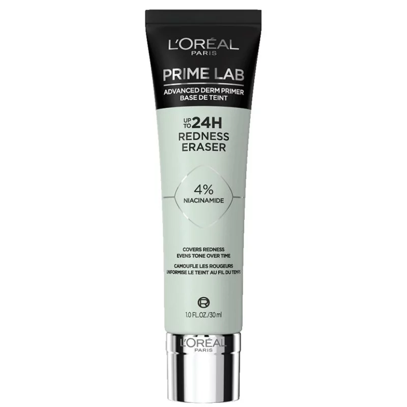 Prime Lab Redness Eraser es la última incorporación a la familia de primers dermocosméticos de L'Oréal Paris. Formulado con un 4% de NIACINAMIDA, corrige instantáneamente las rojeces neutralizándolas gracias a su tono verde hasta 24h*.