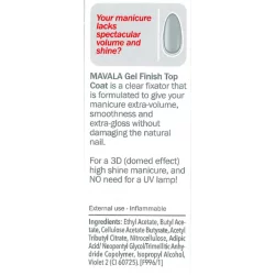 Modo de empleo: Después de aplicar la segunda capa de esmalte de uñas, espere un momento. Luego aplicar TOP COAT GEL en la superficie de toda la uña, incluyendo el extremo libre y la parte inferior de ésta, si es posible, para aumentar así la duración del esmaltado.