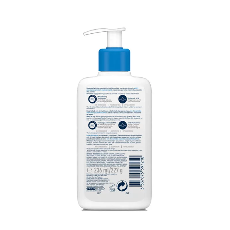 Su fórmula ligera y no grasa, desarrollada por dermatólogos, incluye ácido hialurónico, 3 ceramidas esenciales y glicerina. Esta combinación junto a la tecnología MVE®, consiguen una hidratación durante 24 horas. La fórmula de la loción de Cerave no contiene perfumes, por lo que es apta para pieles sensibles de adultos y niños.