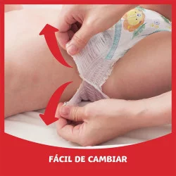 Fácil de poner y de quitar gracias a su cintura elástica. Para ponerlo, súbelo como la ropa interior y para quitarlo, no lo bajes, simplemente, rasga el pañal por los laterales y retíralo.
