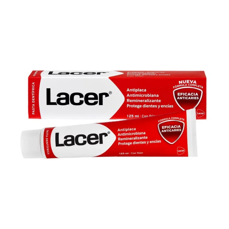 Lacer pasta dentífrica contiene 2.500 ppm de ion fluoruro, previene la placa bacteriana (antiplaca), combate la flora causante de la caries y refuerza el esmalte y la dentina proporcionando una protección integral de tu boca.