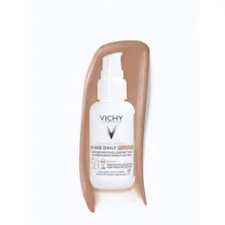 UV-AGE DAILY es un fluido antifotoenvejecimiento de Vichy, con una acción doble protectora y correctora. Su tecnología Netlock multipatentada forma una película protectora contra los rayos UV ultrafina y ultrarresistente para una alta protección contra los rayos UVA y UVB, responsables de más del 80 % de los signos de envejecimiento. Además, es un solar para deportistas, resistente al sudor y apto para un uso diario activo. Ahora disponible en una versión con color, enriquecida con pigmentos minerales, proporciona una cobertura ligera para mejorar el tono de la piel.