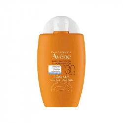 Protección solar alta para pieles sensibles mixtas o grasas. Este tratamiento diario matifica la piel para conseguir un cutis luminoso, radiante y fresco. Ultra Mat Aqua-fluido SPF 30 contiene el complejo exclusivo de activos de protección Sunsitive® Protection, desarrollado por Pierre Fabre. Este sistema de filtros patentado ofrece una protección UVB-UVA muy amplia y fotoestable. Para una mayor protección celular contra los radicales libres, este cómodo fluido contiene un complejo antioxidante único, con un precursor fotoestable de la vitamina E (pretocoferil) y un precursor fotoestable de la vitamina C (ascorbil glucósido). El activo monolaurina y el Agua termal de Avène, conocida por sus propiedades calmantes, antiirritantes y suavizantes, completan esta fórmula para proporcionar una sensación refrescante tras su aplicación. Su nueva textura ultraligera de tacto seco y empolvado deja un acabado no graso y sin brillos.