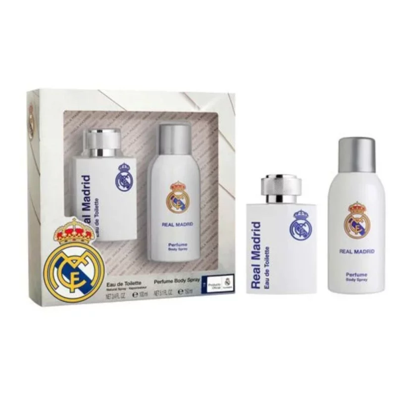 La caja contiene: 1 botella de Real Madrid Eau de Toilette de 100 ml + 1 botella de desodorante en spray.