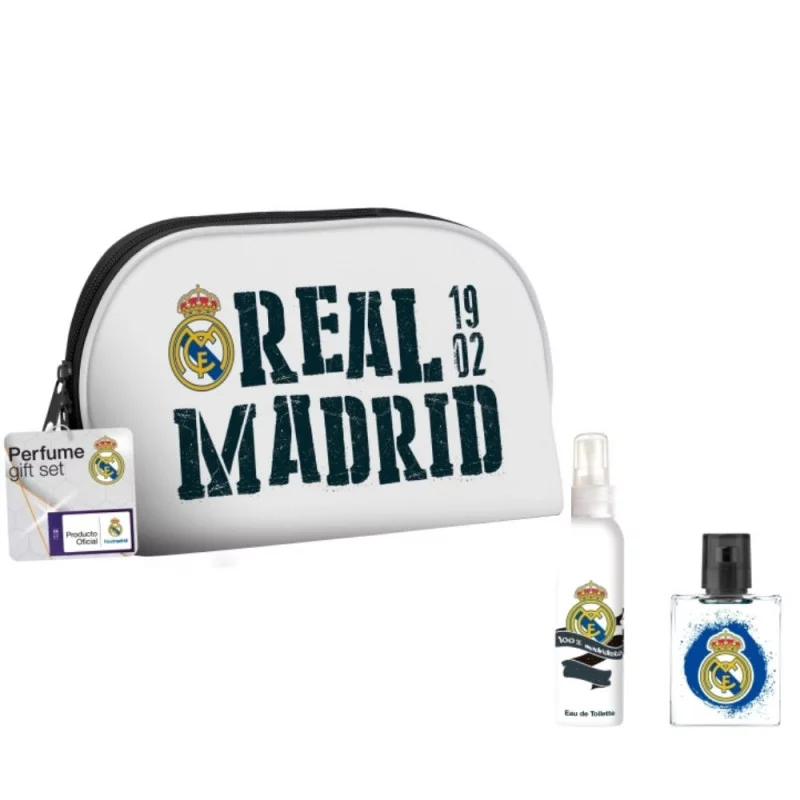 El kit de aseo Real Madrid contiene 50 ml de notas cítricas cítricas y almizcladas y 100 ml de colonia corporal para llevar.