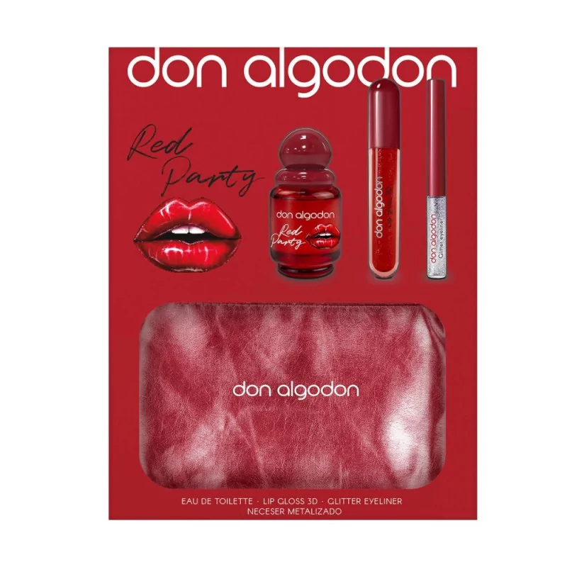 Este conjunto de DON ALGODÓN Red Party Eau de Toilette incluye un delineador de ojos con brillo plateado, un gloss labial voluminizador en un tono rojo carmín y un bolso rojo metalizado elegante, ideal para completar el estilo.