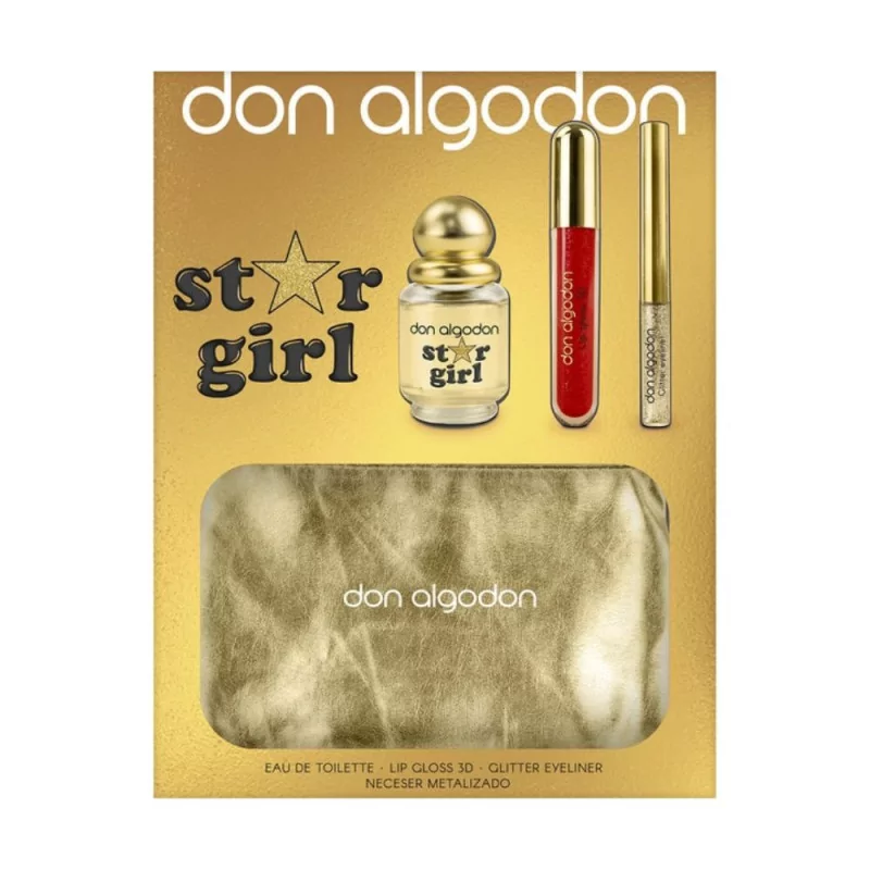 Destaca con el Pack de Regalo Star Girl de Don Algodón. Contiene la fragancia Star Girl de 30 ml, un brillo labial rojo en 3D, un lápiz de ojos con glitter y un estuche metalizado. Es el conjunto ideal para mujeres que desean lucir con elegancia.