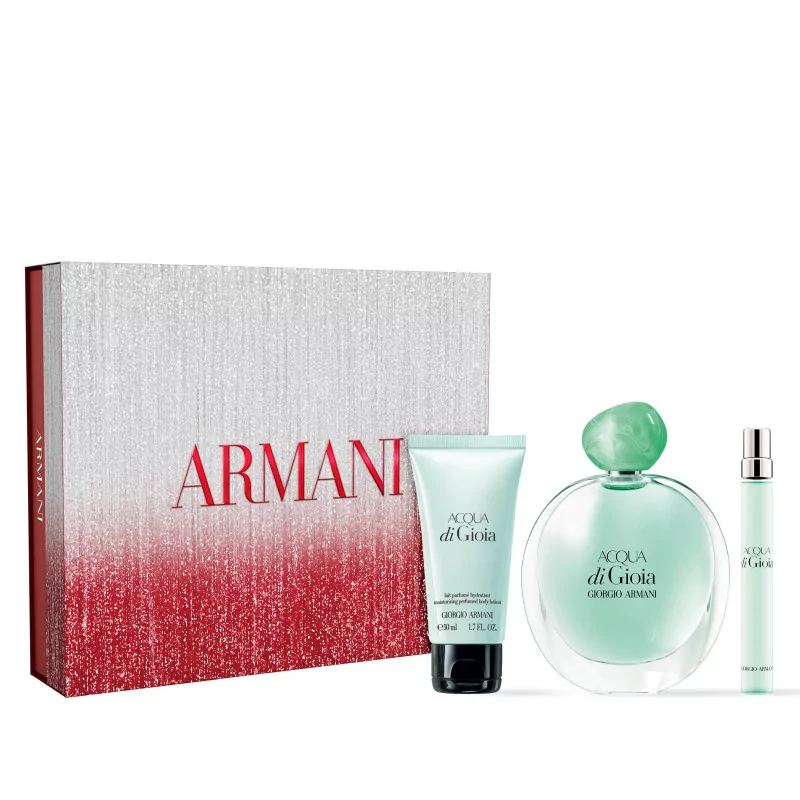 - Acqua di Gioia Eau de Parfum en formato 100 ml y 15 ml: un perfume de mujer acuático cuyo nombre significa "Agua de alegría". Esta emblemática fragancia femenina de Giorgio Armani posee notas de limón primofiori, jazmín blanco y cedro, para un aroma cítrico amaderado.