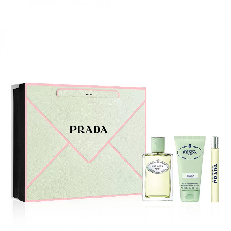 El efecto de cuero saffiano de la caja de regalo le da un toque sofisticado. Además, en el frente, presenta una tarjeta de regalo desmontable para que escribas un mensaje especial a esa persona querida. La caja está diseñada ecológicamente para apoyar el compromiso de Prada con el lujo sostenible.