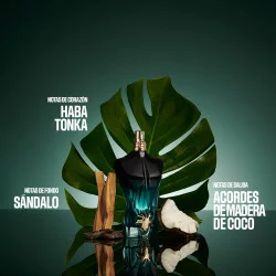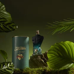 La desnudez del frasco. La virilidad del vidrio. Del negro lacado al verde transparente, Le Beau Le Parfum intensifica el degradé de su torso musculoso y de su fragancia. Con una hoja de parra dorada como único ropaje. ¿Cómo resistirse a la tentación?