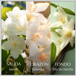 Jasmine Eau de Toilette es una fragancia floral que celebra a las mujeres hermosas. Su aroma es una fragancia rica y misteriosa, producto de hermosas flores blancas, con notas verdes y amaderadas.