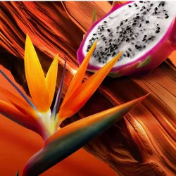 Al inicio, un acorde de fruta del dragón dulce activa los sentidos con su vibrante jugosidad, mientras que el atractivo exótico del acorde de ave del paraíso florece en aromas tropicales.