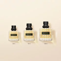 Born in Roma Yellow Dream Donna Eau de Parfum comienza su fragancia de ensueño con la delicadeza y frescura del acorde de limón. La esencia de rosa turca crea una feminidad floreciente y luminosa en su corazón. Las notas reconfortantes del almizcle blanco suavizan el final de la fragancia. El diseño del frasco es un homenaje al icónico Rockstud, una audaz estructura piramidal inspirada en la arquitectura romana, firma de la Maison Valentino. El frasco de cristal deja ver el jugo color amarillo, que representa la luz solar que baña las calles de Roma.