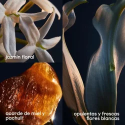 Sus notas florales y amaderadas combinan flores frescas pero carnales con un toque sexy de pachuli. Un aroma fresco, seductor, sensual y adictivo que no pasa desapercibido.