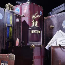 Salida inmediata del Scandal Express, el nuevo tren exclusivo de Jean Paul Gaultier. Al caer la noche, Scandal Intense difunde una fragante adicción al placer sin límites y a las veladas eternas. ¡Hola a la decadencia! ¡Adiós al decoro! El viaje promete ser mucho más emocionante que el destino. La más deseable e indisciplinada de las pasajeras luce las despampanantes piernas de un frasco violeta con rayas sensuales bajo su terciopelo rosa. Con su estela floral de vainilla, cada vagón olvida su destino. ¿Hasta dónde nos llevará? Respuesta en destino...