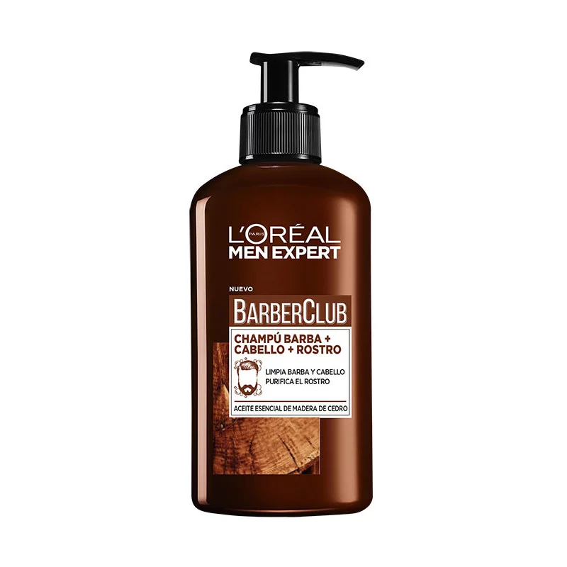 Descubre el primer Champú 3 en 1 para Barba, Cabello y Rostro Barber Club, enriquecido con Aceite Esencial de Madera de Cedro, para un cuidado experto de tu barba, cabello y rostro.