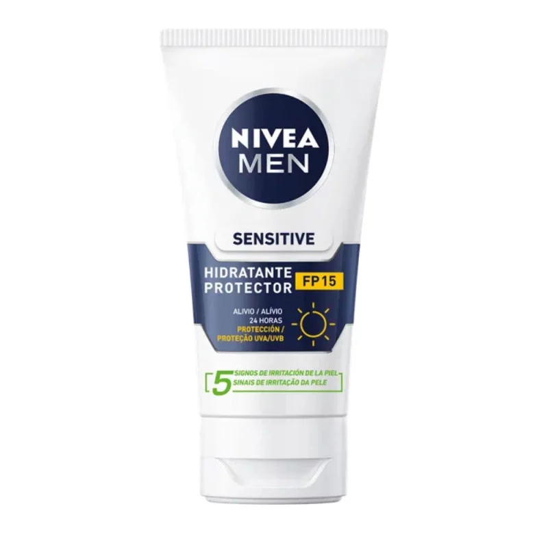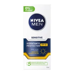 NIVEA MEN Sensitive Hidratante Facial Protector FP15 ofrece cuidado calmante y protección para los hombres con piel sensible. Su fórmula suave sin alcohol enriquecida con Camomila, Hamamelis y Vitamina E hidrata y suaviza intensamente la piel proporcionando un alivio duradero de los 5 signos de irritación de la piel, como el ardor, el enrojecimiento, la sequedad, la tirantez y los picores. Además protege de los rayos UVA/UVB con su factor de protección solar 15 ayudando a prevenir las quemaduras solares. Fórmula de rápida absorción, no deja sensación grasa ni pegajosa.
