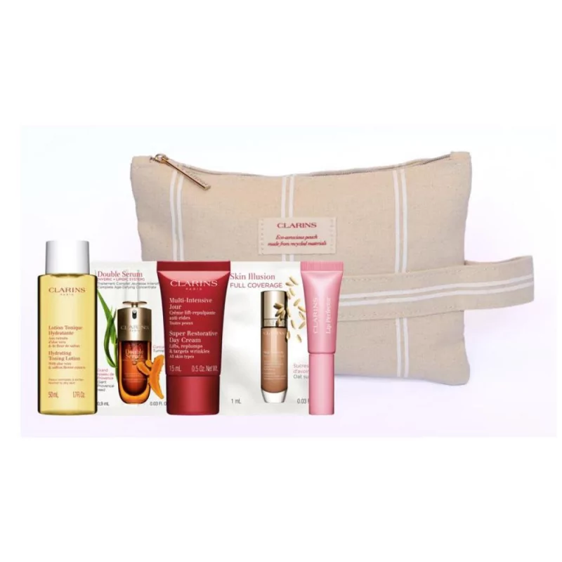 Regalo de un neceser con las miniaturas por compra de dos productos de tratamiento de Clarins
